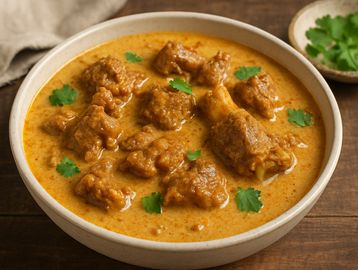 Lammfleisch aus der Keule in einer milden Joghurt-Sahne-Sauce gekocht mit Kardamom, Kreuzkümmel, Zimt, Koriander gewürzt und mit gebratenem Curry verfeinert. (7)